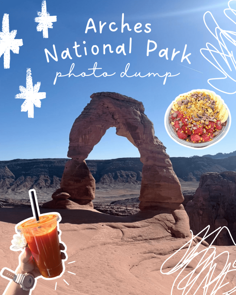 Day 9: Sightsee all the popular arches including the Windows, Turret Arch, Double Arch, Balanced Rock, and Cove of Caves (all can be seen from the parking lot/road, but walking up to them shifts your perspective, and I would recommended), hike to Delicate Arch (3 mile out-and-back), swing by Desert Tropics Health Bar for a vegan smoothie bowl or hand-pressed juice