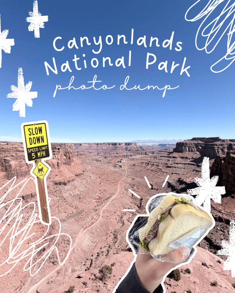 Books, Bites, Insights? Stock up on food and gas in Moab before heading to The Needles District (Southern portion of Canyonlands National Parks). There is no paved road to connect the Northern portion of the park to the Southern portion. Once you leave Moab, grocery stores and gas stations quickly become far and few.