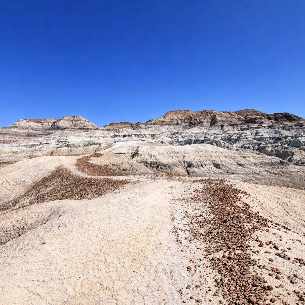 - Keep driving south to get to the Historic Blue Forest Trail, an old 2.7 mile out-and-back CCC trail that takes you directly to the Blue Mesa Trail, an additional 1 mile paved loop. This was my favorite trail in the park, but I wouldn’t of known about it without using the AllTrails app. There is a pullout to mark the trailhead, but this trail is not listed on the park’s official map. The blue, gray, and purple badlands created an experience that was unlike any I’ve had on my 63 in 365 journey. And as an added treat, this trail was the first portion of the park where I began to see the namesake petrified wood scattered about.